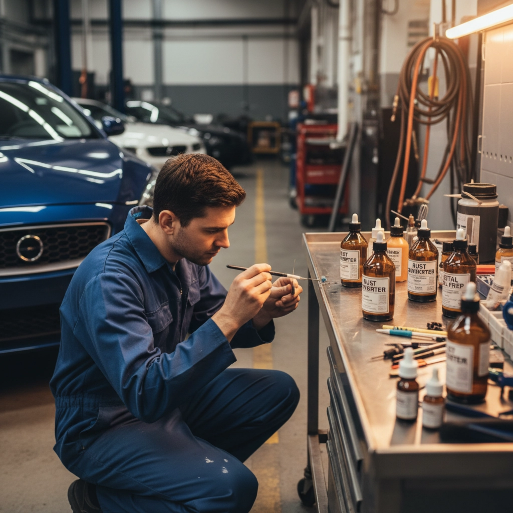 For rust treatment, avoid using sandpaper or abrasive methods on localised stone chip areas, as these can enlarge the damaged area unnecessarily. Instead, apply a high-quality rust converter or rust remover specifically designed for automotive applications. Rust converters transform existing rust into a stable, paintable substrate, while rust removers dissolve rust completely, leaving clean metal ready for protection.