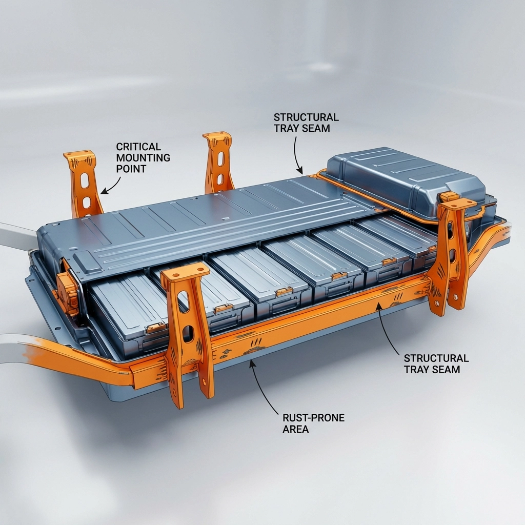 The battery tray represents the most critical area requiring protection in any electric vehicle. Corrosion around battery tray seams proves extremely costly to repair and requires early preventative protection. The substantial weight of EV battery packs creates stress concentrations at mounting points, making these areas particularly susceptible to corrosion-induced failure.