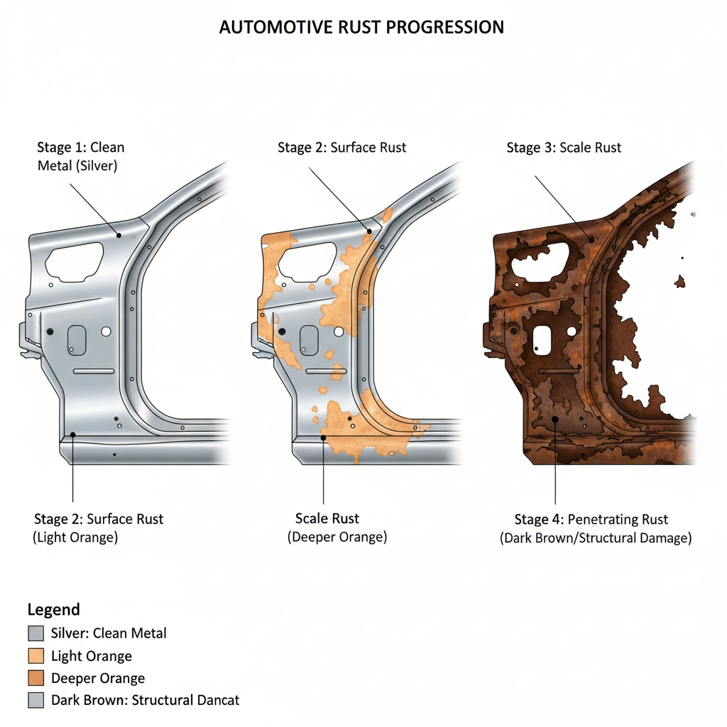 Understanding how rust progresses through distinct stages helps vehicle owners recognise the urgency of intervention at different points.