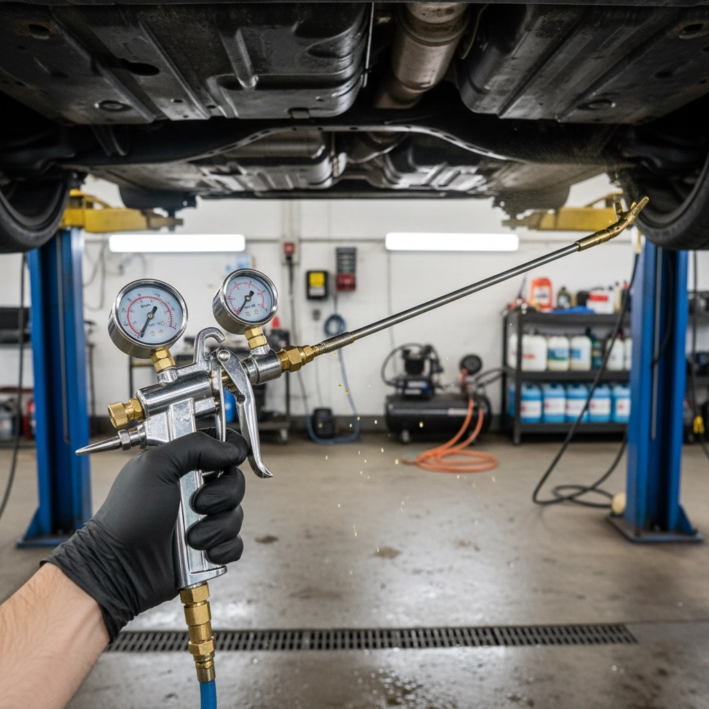 Professional rustproofing requires two distinct spraying systems: undercarriage application equipment for comprehensive underbody coverage, and cavity spraying tools for internal body panels, chassis rails, and hard-to-reach areas. Each system operates under different pressure requirements and uses specialized nozzles designed for specific rustproofing materials.