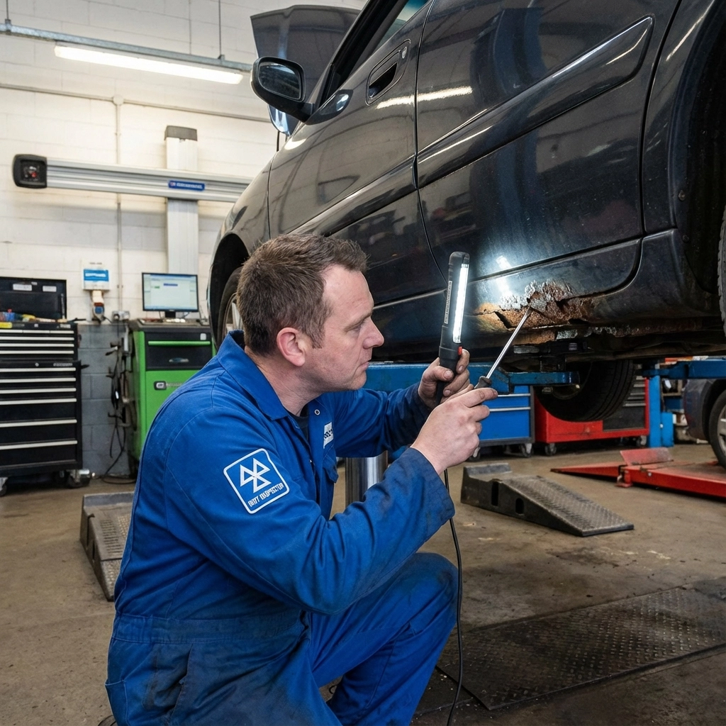 The tester will examine areas including the underside of the vehicle, wheel arches, door frames, sills, and any visible chassis components. They're specifically looking for rust that has created holes, significantly weakened metal, or spread to critical areas. Surface rust that hasn't compromised structural integrity may result in an advisory rather than a failure.